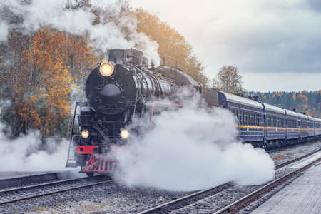 Retro steam train departs from the station wooden platform at cloudy autumn evening.