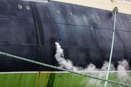 Close-up of vintage ship deck vents, featuring brass and green metal, with steam rising from the top, showcasing intricate details and textures.
