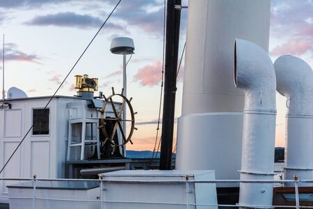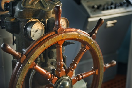 A closeup shot of a round controlling mechanism of a ship with a blurred background