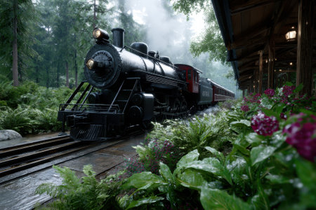 A classic steam engine pulls into a forest station surrounded by lush greenery and vibrant flowers in the morning mist.