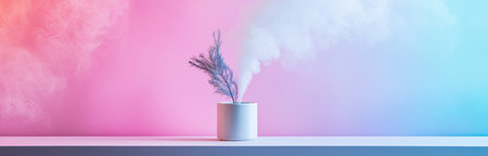 A minimalist white pot holds a dry plant, emitting a gentle mist. This tranquil setup features a vibrant pink and blue gradient background, creating a calming atmosphere.