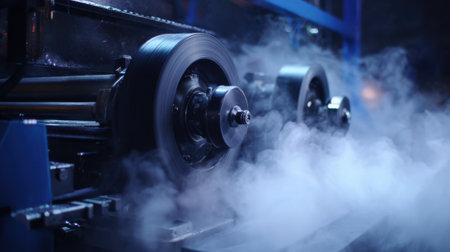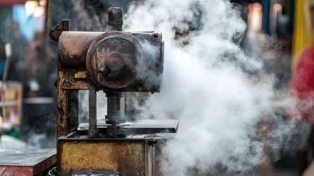 An intriguing vintage steam machine releasing clouds of smoke in an industrial workshop. The image highlights the beauty of craftsmanship and the power of engineering.