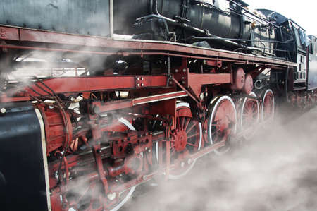 Steam train locomotive engine wheels close-up with steam coming out. With colour toning