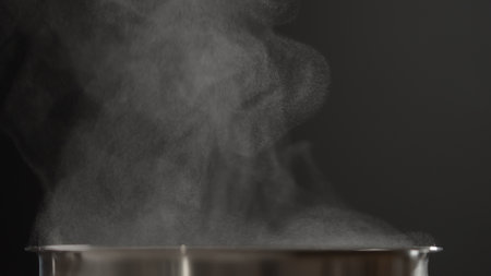 closeup shot of steam rising from steel saucepan on stove