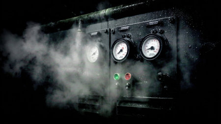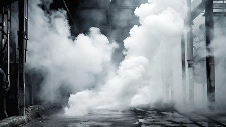 A dramatic representation of an industrial pipe system emitting steam in a dark environment, highlighting the intricacies of machinery and engineering in industry.