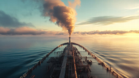 A massive oil tanker glides across serene ocean waters, with dark smoke billowing from its chimneys against a vibrant sunset.