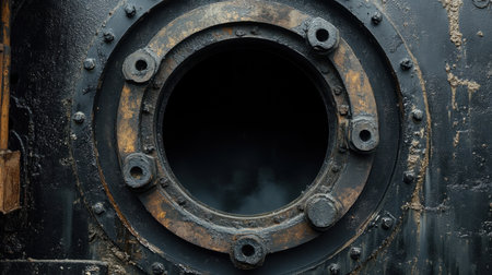 This image features a close-up view of a rusty porthole on an old steam engine, showcasing intricate textures and a dark interior, evoking a sense of history.