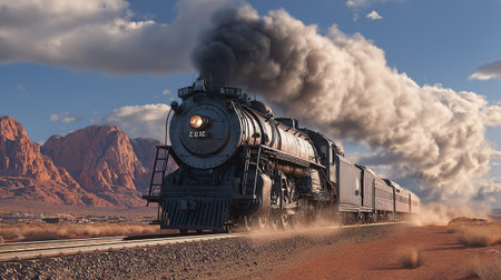 A mighty steam-powered train thunders along desert tracks, surrounded by rocky formations and morning light.