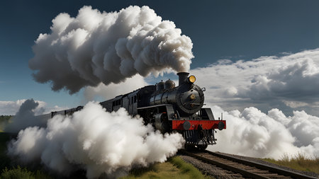 Enigmatic clouds of steam billow from an old-fashioned locomotive, evoking a sense of nostalgia