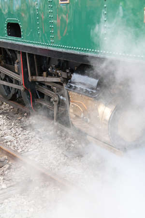 Steam train locomotive engine wheels close-up with steam coming out. With colour toning