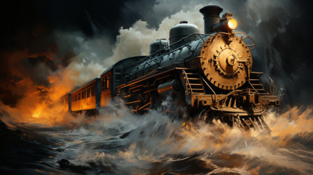 A billowing cloud of smoke engulfs the steaming locomotive as it charges down the stormy outdoor track, a wild and powerful force of steel and steam