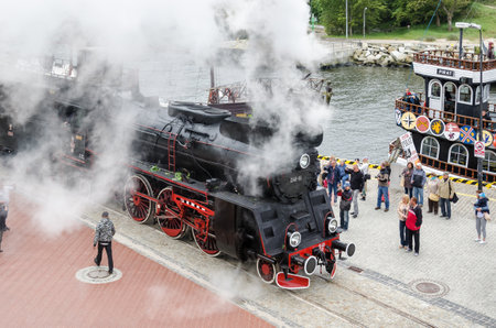 KOLOBRZEG, WEST POMERANIAN / POLAND - 2017: Steam locomotive with a courtesy visit to the seaport