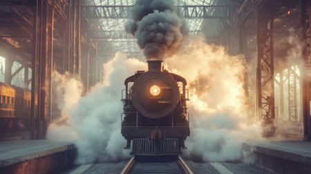A vintage steam locomotive emerges dramatically from an abandoned train depot, enveloped in smoke and bathed in atmospheric light, invoking feelings of nostalgia.