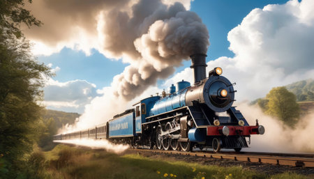A powerful steam train with a classic blue design makes its way through a verdant landscape under a cloudy sky. AI generation