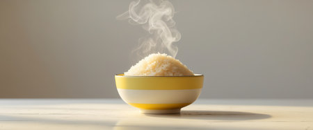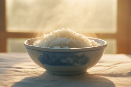 A bowl of freshly cooked rice is on the table. Generated by artificial intelligence.