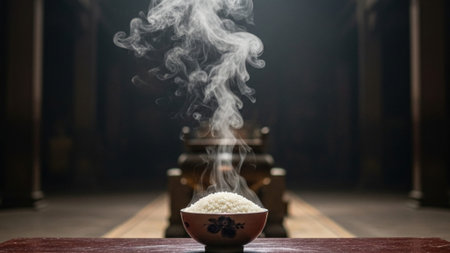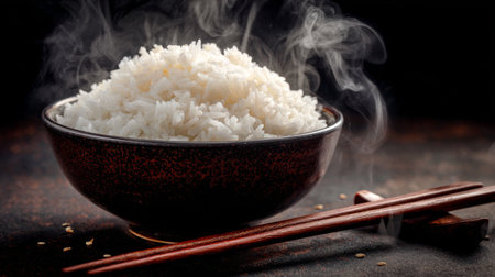 A steaming bowl of rice emits vapor in a dark setting, creating a warm and inviting atmosphere. Ideal for culinary themes, comfort food, and Asian cuisine.