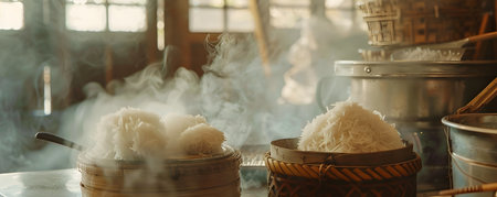 This image captures the traditional process of preparing sticky rice a staple food in Thai cuisine The scene depicts a rustic kitchen setting with a steaming bamboo basket filled with fluffy freshly