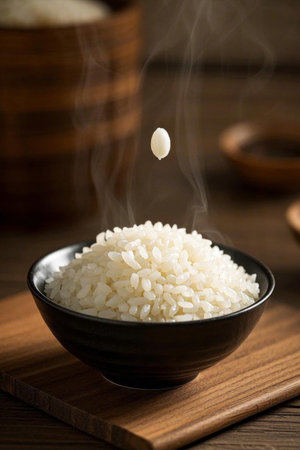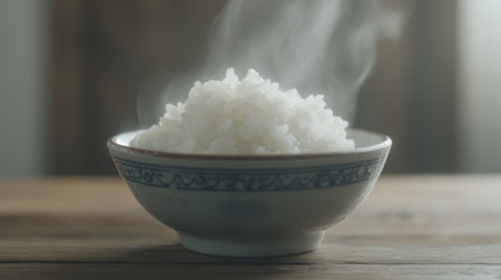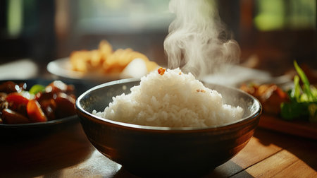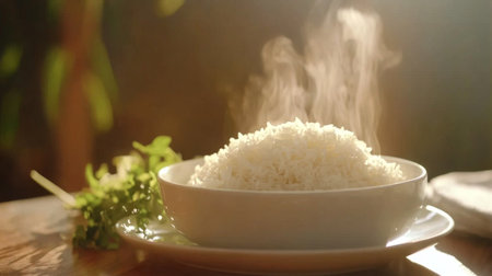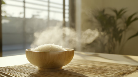 A steaming bowl of freshly cooked rice sits on a wooden table, emitting delicate wisps of steam. The warm ambiance and soft light create a cozy and inviting atmosphere.