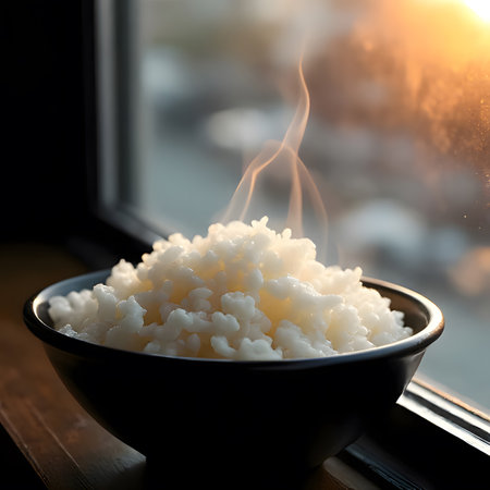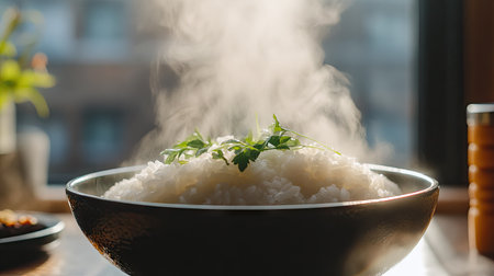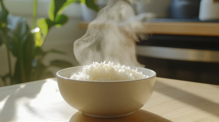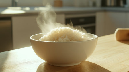 A steaming bowl of freshly cooked rice sits in a sunlit kitchen, radiating warmth and inviting aromas, showcasing the beauty of simple culinary art.