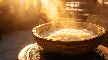 A stunning image of freshly cooked rice steaming in a traditional bamboo basket, illuminated by warm golden sunlight, creating a cozy and inviting atmosphere.