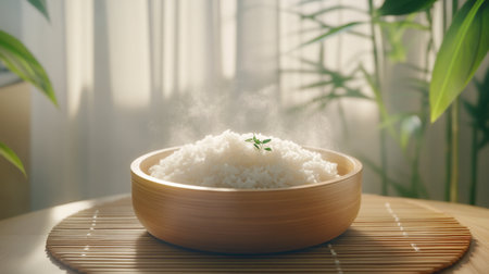 A steaming bowl of fresh rice sits elegantly in natural light, showcasing its fluffy texture. Perfect for food photography, cooking scenes, or meal prep visuals.