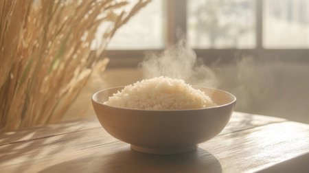 A bowl of fluffy steamed rice with steam rising, placed on a wooden table with soft natural light filtering through, creating a warm and inviting feel.