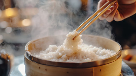 A close-up of a hand serving with chopsticks, perfectly portioned and steaming, highlighting the art of enjoying rice in Asian dining culture.