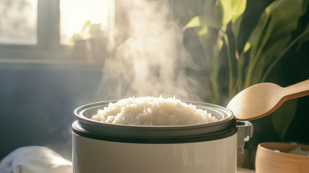 A dynamic shot of a rice cooker with the lid open, revealing a pot of perfectly cooked rice and a wooden rice paddle ready for serving.
