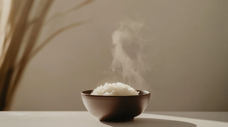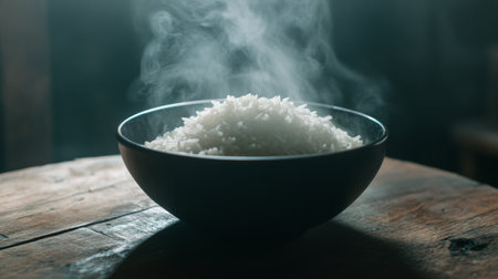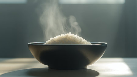 A minimalist image of freshly cooked rice in a dark bowl, gently wafting steam captures the essence of comfort and warmth in dining. Perfect for culinary themes.