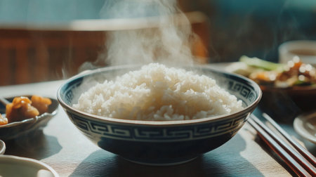 A steaming bowl of rice sits invitingly on a beautifully arranged table, capturing the essence of comfort and warmth in an Asian dining setting.