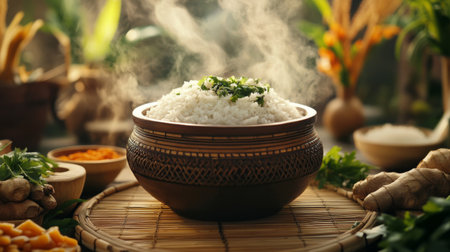 A steaming bowl of rice rests atop a rustic bamboo mat, surrounded by fresh herbs. This inviting scene captures the essence of wholesome, natural cooking.