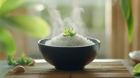 A steaming bowl of fluffy white rice sits elegantly on a bamboo mat, complemented by chopsticks. This image captures the essence of comfort food in Asian cuisine.