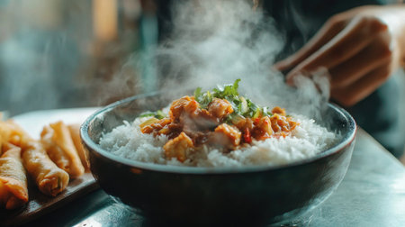 Close-up of a hot bowl of rice being served with a delicious curry, with steam rising and a side of crispy spring rolls on the table