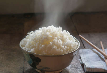 A steaming bowl of freshly cooked white rice sits on a rustic wooden table, exuding warmth and comfort. Perfect for any meal or cuisine.