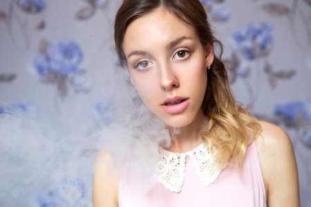 Portrait of sexy young lady smoking on a background of gray wall.