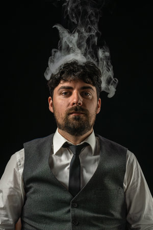 Young man with smoke in front of head