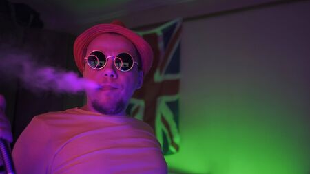 Smoker of Hookah Exhaling Smoke Up In Neon Lighting. Man in sunglasses in self-isolation at home smokes in room with neon lights on GB flag Background.