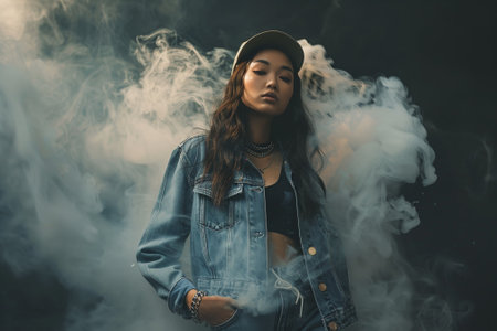 A woman in a black top and blue jacket stands in front of a cloud of smoke. The smoke is thick and hazy, giving the scene a mysterious and moody atmosphere