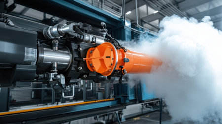 This image showcases advanced industrial equipment emitting smoke, highlighting modern technology in manufacturing settings. The design focuses on efficiency and performance.