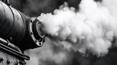 A dramatic shot of steam billowing out of a train locomotive, with the powerful engine and vintage design adding to the historical and industrial ambiance.