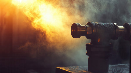 captures a nozzle releasing a cloud of mist dark setting highlighting the details of the industrial equipment and the interplay of light and steam.