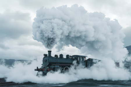 A classic steam train, shrouded in mist, creating a dramatic and nostalgic visual.