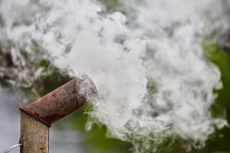 Smoke from an old rusty metal pipe from a street stove, hearth.
