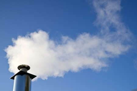 White smoke streaming out of a large industrial smoke stack at a factory. Close up image. High quality photo