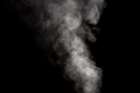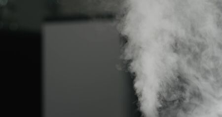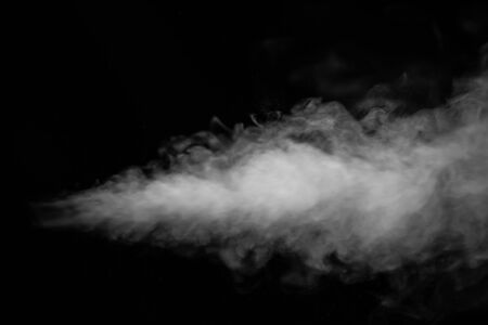 White vapor spray steam from air saturator. Smoke fragments on a black background. Abstract background, design element, for overlay on pictures