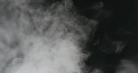 Close-up of white smoke clouds against a black background. Contrast of brightly lit smoke and dark room. Cinematographic light.