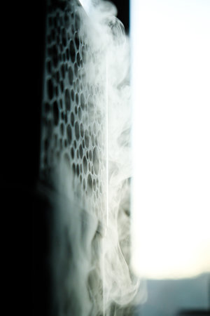 Vapor from humidifier in the morning light. Steam from the air humidifier. Air humidity level in a home. Selective focus. High quality photo