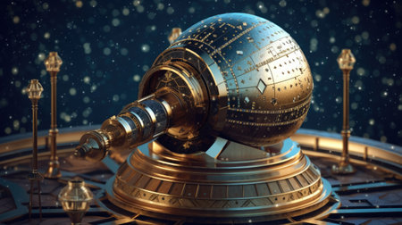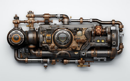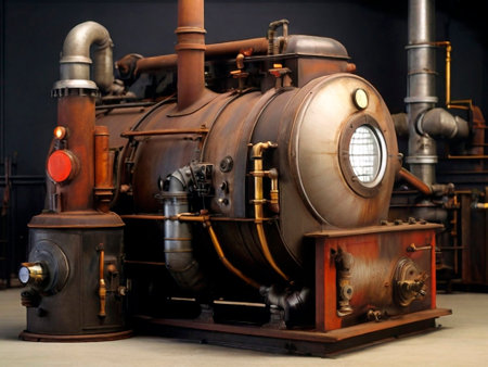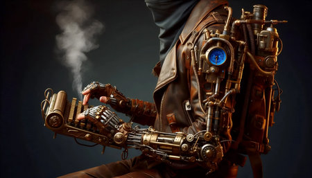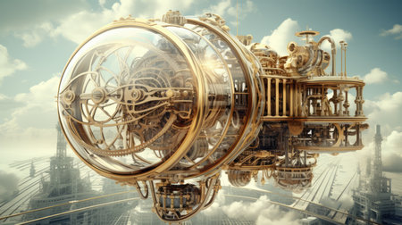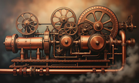 This image showcases an intricate steampunk mechanical device featuring a stunning metallic finish and steam effects against a dark background, emphasizing artistic craftsmanship.