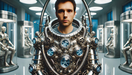 A young man in a highly detailed, futuristic exoskeleton suit stands in the center of a high-tech laboratory. The suit is adorned with numerous intricate gears, tubes, and glowing blue elements, giving it a steampunk aesthetic. Behind him, several humanoid robots are encased in cylindrical pods, illuminated by cool white lights. The laboratory has a sleek, metallic interior with large circular light fixtures on the ceiling.
