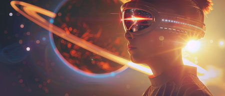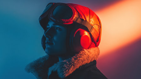 A striking profile of a stylish young individual wearing vintage aviator gear, highlighted by a captivating lens flare and dynamic lighting, showcasing modern photography techniques.